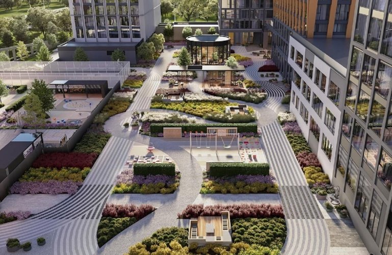 Внутренний двор комплекса — это уединённое пространство для отдыха и релаксации, центром которого служит изящный фонтан с многоуровневой подачей воды и подсветкой в вечернее время. Вокруг выложены широкие прогулочные дорожки, разбиты клумбы с многолетними растениями и установлены уютные лавочки в тени декоративных деревьев.